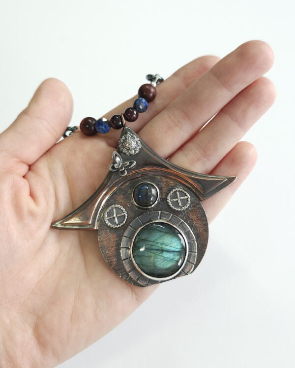 Inspired by a cozy hobbit house with a round door and the charm of a mushroom-like rooftop, this pendant features two glowing Labradorite gemstones as the door and window, set in copper and sterling silver. On the back, a friendly gnome welcomes you with a warm smile, cookie, and tea. 🙂