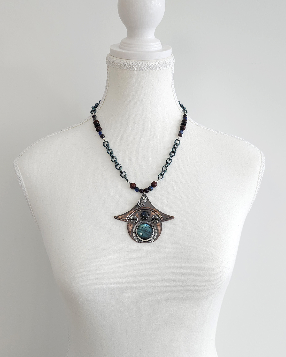 This whimsical one-of-a-kind pendant hangs on a patinaed sterling silver chain, which has developed a dark bluish tone that complements the Labradorite. Garnet, Azurite, and wood beads add a woodland touch to the chain, making this storytelling piece feel both magical and down-to-earth.