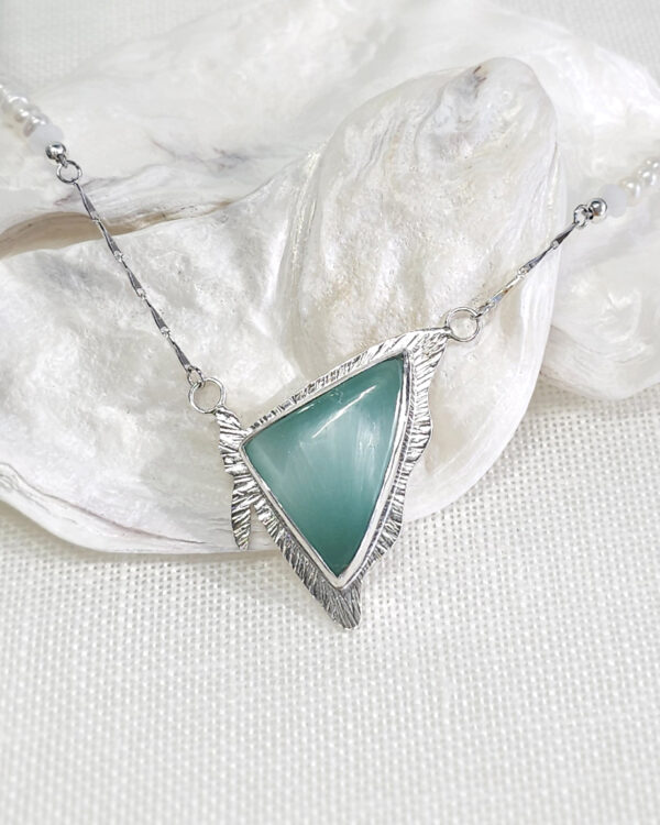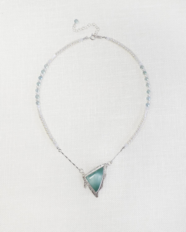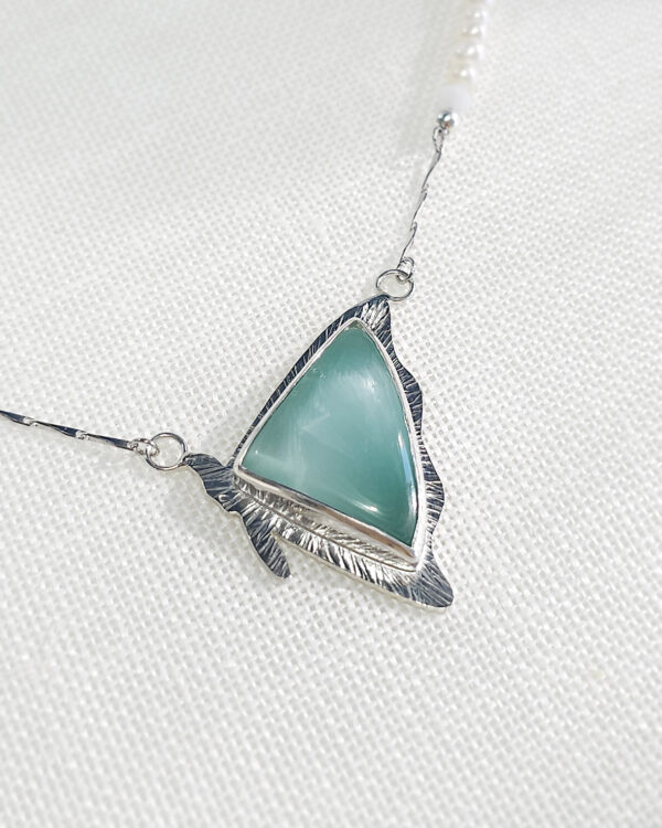 Handcrafted from texturized sterling silver, this pendant captures the graceful character of a butterfly. Set with a serene green Angelite gemstone, it radiates a gentle charm. Accented with Pearls and Blue Fluorite, it comes together as a ready-to-wear necklace that brings a touch of calm elegance to any look.